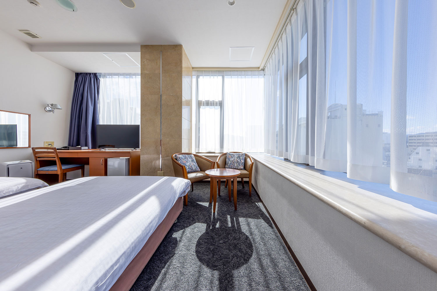 ベッドはセミダブルサイズが基本の客室でゆっくりくつろぎの時間をお過ごし下さい。